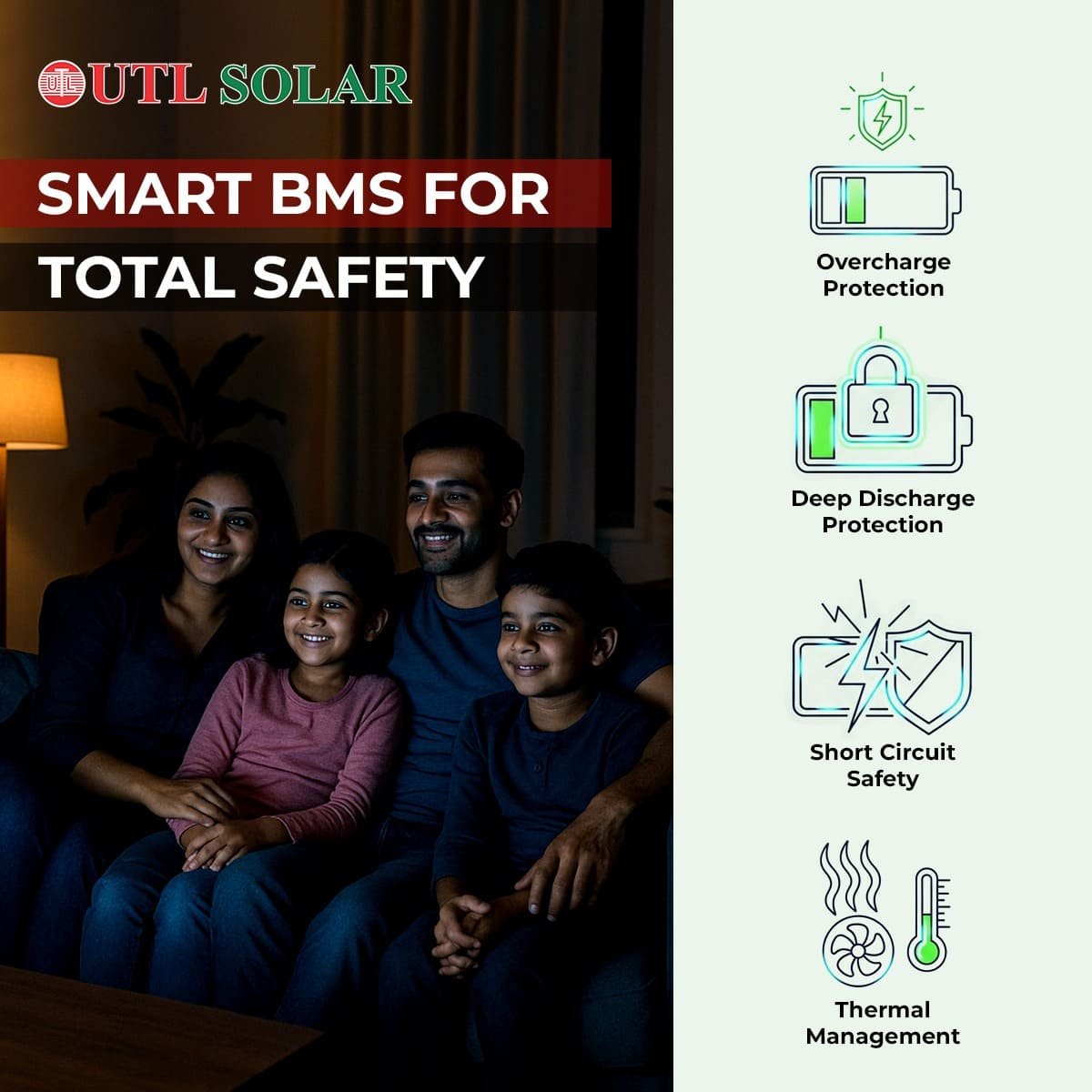 Built with advanced prismatic LiFePO4 cells, this battery ensures a long cycle life of 3000–3500 cycles, delivering up to 10 years of reliable performance. Its inbuilt BMS provides complete protection against overcharge, deep discharge, short-circuits, and overheating, making it a safe and dependable energy solution.