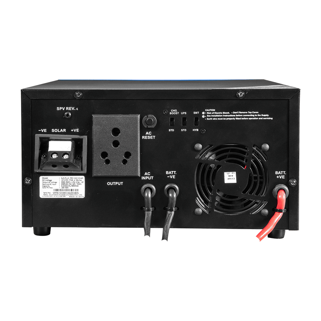 The SUN PLUS PRO 1420 rMPPT Solar Inverter is a next-generation solar inverter engineered for dependable power backup and efficient solar energy utilization in homes and small offices. With a 1100VA system rating, it delivers stable performance for essential appliances while maintaining energy efficiency and battery safety.